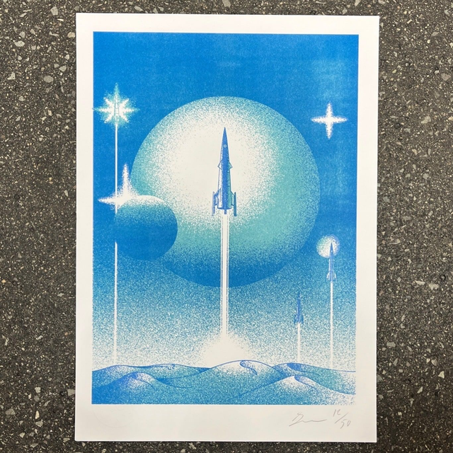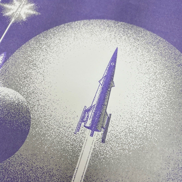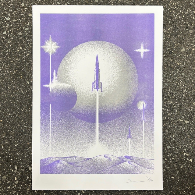 Together with Benni from Druckwelle, we made three different versions of his »Space War« print.
